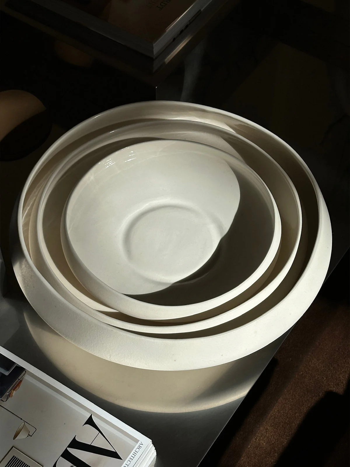 Unsere Centerpiece-Familie zeichnet sich durch ihre organische Form und vielfältige Nutzungsmöglichkeiten aus. Die Größe Large ist ein echtes Statement – ob als Designobjekt, Obstschale oder für größere Magazine und Bücher, sie setzt in jedem Raum einen Blickfang. Gefertigt in Portugal, aus Keramik von Hand gearbeitet: innen glossy lackiert, außen matt und haptisch rau.